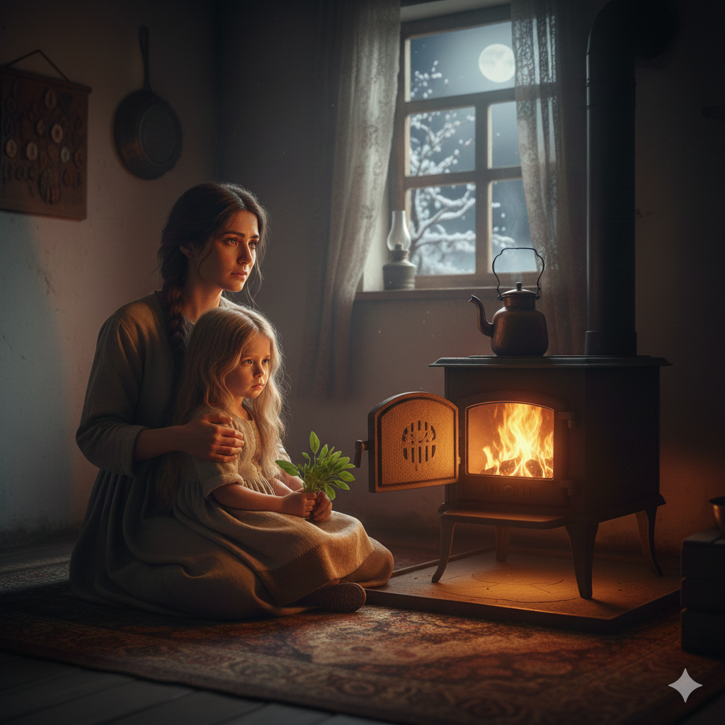Ana kız, sobanın sönmeye yüz tutmuş ateşine bakarak sessizliğe gömülmüşler.