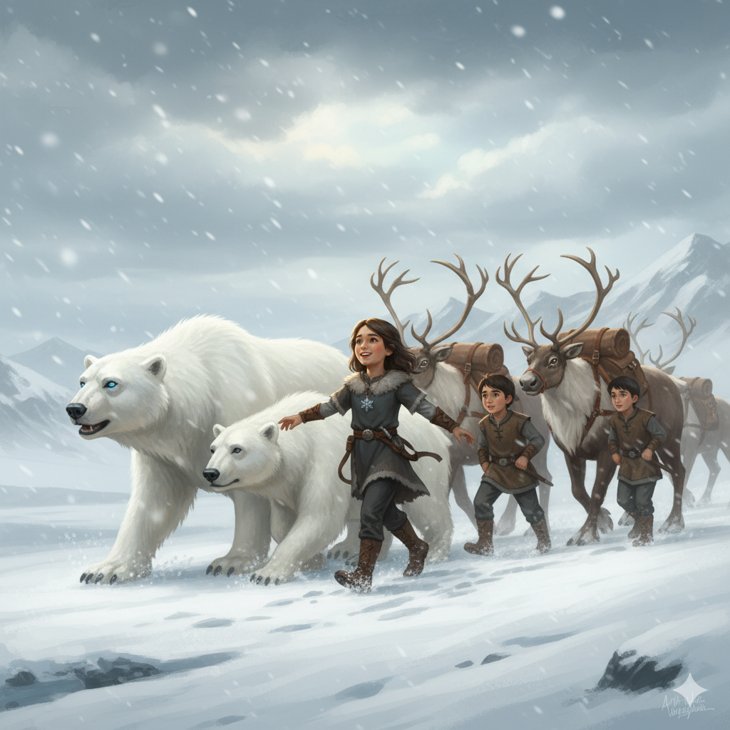 Arkasından gelen Ren geyikleri, çocukların ağır çantalarını sırtlamış. Kocaman, beyaz Kutup Ayıları ise soğuktan titreyen Atlas ve Bulut’un yanına sokularak onlara sıcacık tüyleriyle kalkan olmuşlar. Arya ise soğuktan hiç etkilenmiyor, tıpkı hayranı olduğu Kraliçe Perla gibi karların üzerinde neşeyle yürüyormuş.