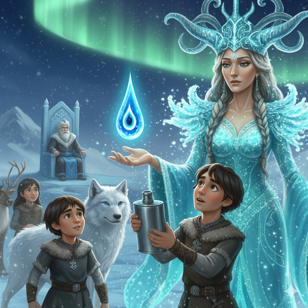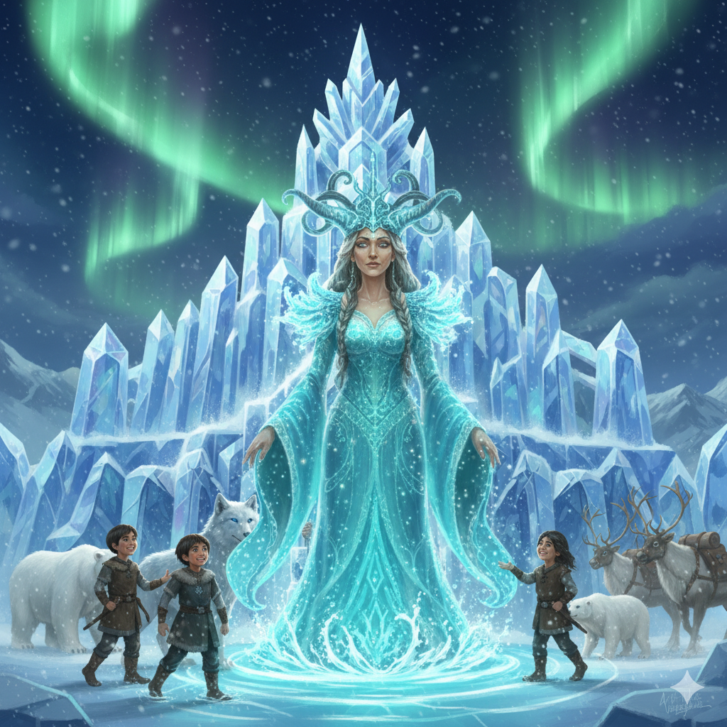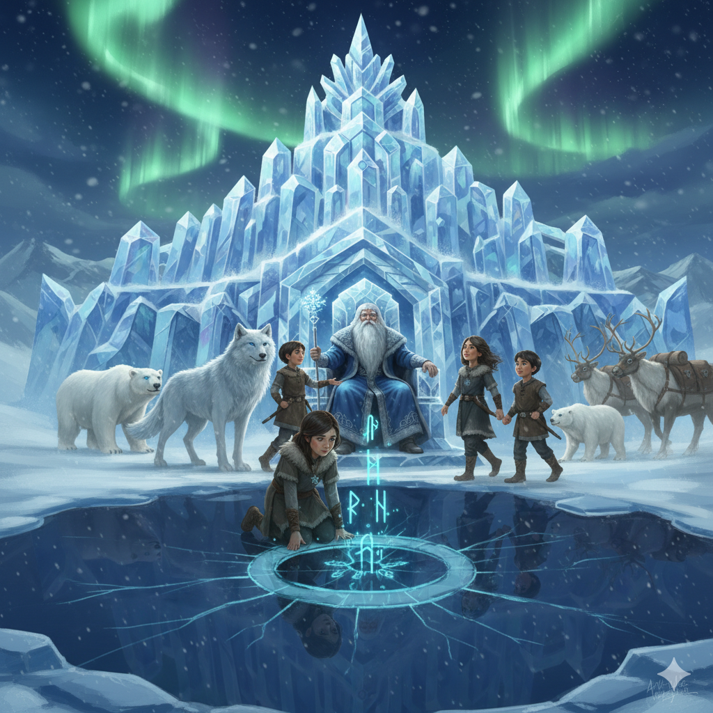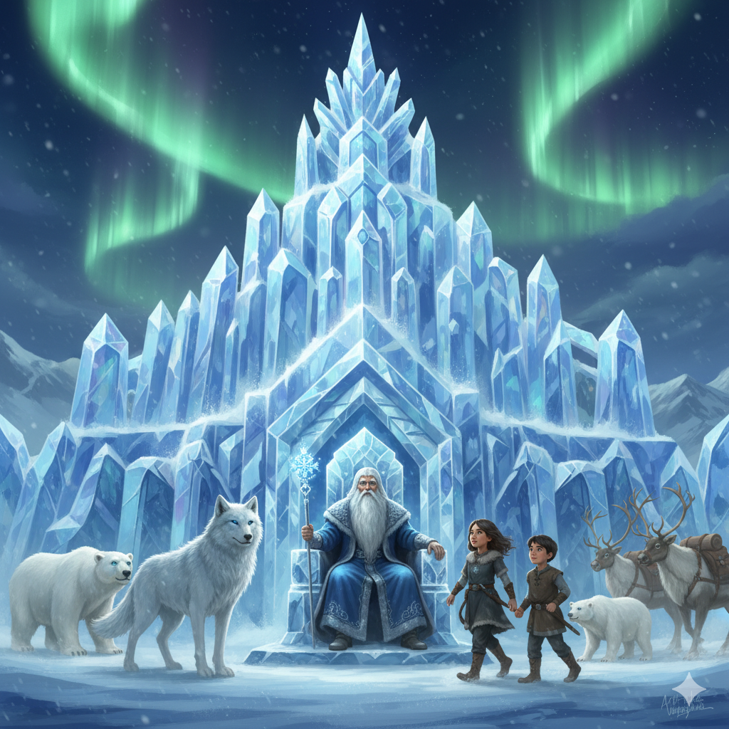 Gökbörü’nün rehberliğinde günlerce yol almışlar. Sonunda, gökyüzünün yeşil ve mor ışıklarla dans ettiği, devasa kristal bir sarayın önüne gelmişler. Burası, soğuğun efendisi Ayaz Ata’nın sarayıymış.