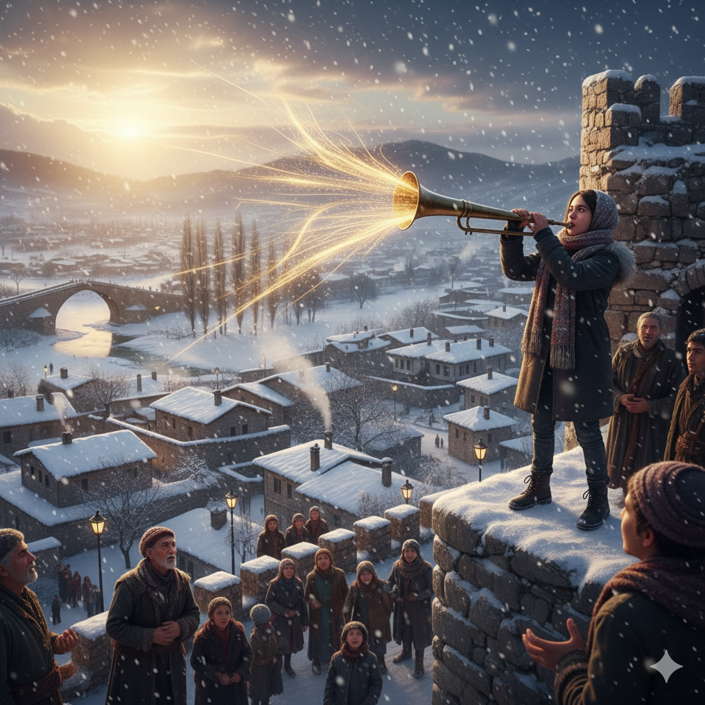 Borazanın sesi ilçenin üzerine yayılırken Sarı Kız’ın gözleri doldu. Çünkü o an sadece bir eski eşyayı değil, geçmişin hatıralarını da yeniden canlandırdığını hissetti. Dedesi Mehmet Ağa’nın cesareti, adaleti ve halkına duyduğu güven, borazanın yankısında yeniden doğmuştu. Köprüden geçenler, evlerinin penceresinden bakanlar, karların içinde yürüyenler borazanın sesini duyunca sanki kalplerinde eski bir güç uyandı. Yaşlılar başlarını kaldırıp göğe baktı, gençler birbirine umutla gülümsedi. Sarı Kız, karla kaplı kalenin burcunda borazanı ellerinde tutarken içinden bir şeyin kıpırdadığını hissetti. Belki bu sadece çocukça bir heyecan değildi. Belki de geçmişten ona uzanan bir sorumluluktu. Arkadaşlarına döndü, gözleri kararlıydı: “Bu şehir bizim. Dedelerimizin cesaretiyle, analarımızın sevgisiyle ayakta duruyor. Ben de onların yolundan gideceğim. İnsanların birbirine güvenmesi, adaletin sürmesi için elimden geleni yapacağım.”