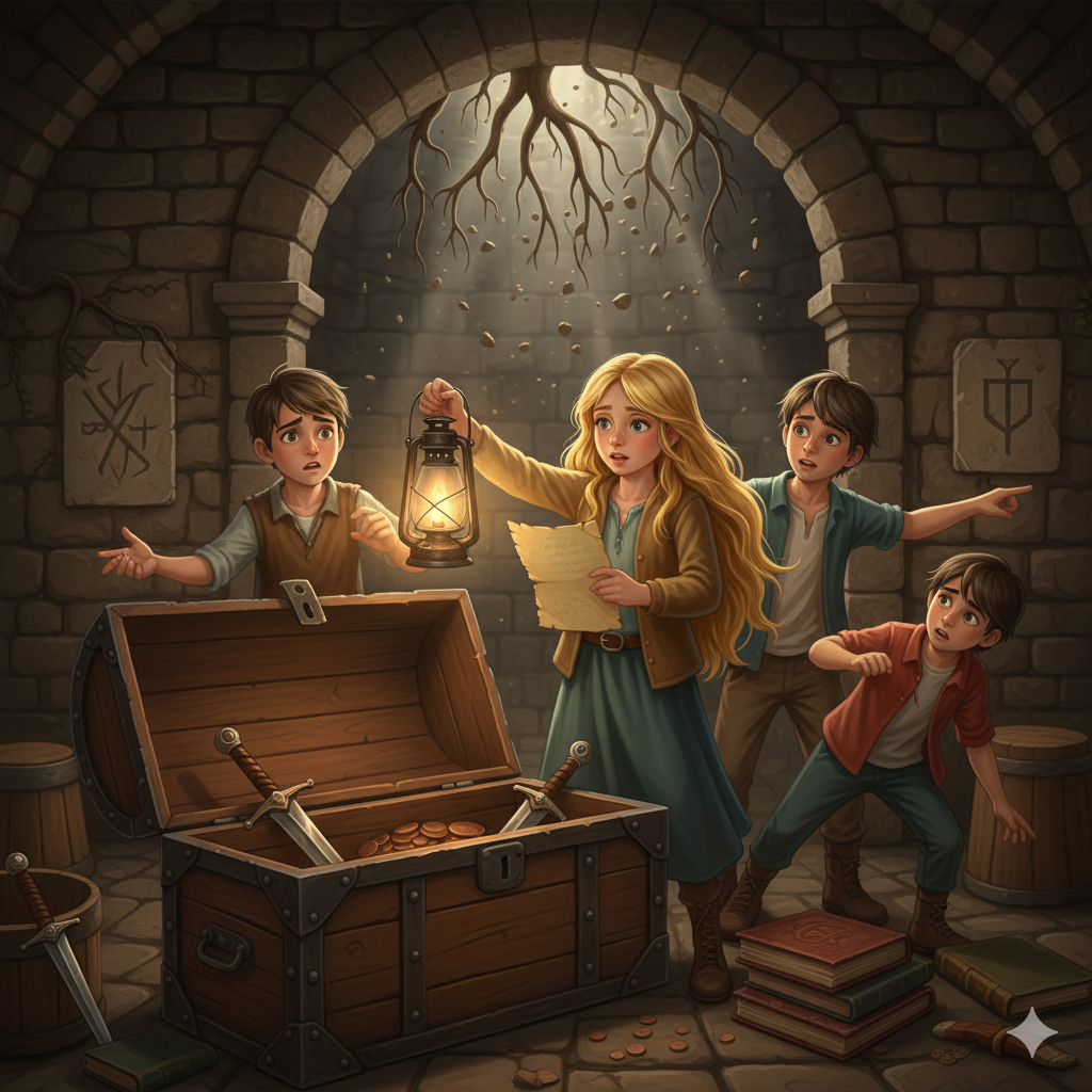 Kapının ardı küçük bir odacık gibiydi. Duvarları taş, tavandan ince kökler sarkıyordu. Odanın ortasında tahta bir sandık duruyordu, üstü toz ve örümcek ağıyla kaplanmıştı.